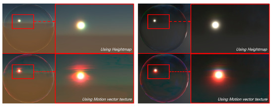 The change in motion of the fluid was compared with the case of using the height map and the case of using the motion vector texture for the UV coordinate of the texture of the soap bubble, which enabled the sampling of the flow shape, thickness, and color value. As shown in Figure 9, there was a clear difference in the light source. When using the height map, only the light source was observed on the surface. The motion vector texture shows the color response from the light source, and the flow shape and irregular velocity of the fluid can be observed. It can be seen that the height map of the grayscale is not suitable for UV Coordinate and is controlled by the red and green values of the motion vector texture. In addition, the color response observed from the light source can be variously changed by adjusting the smoothness intensity parameter. In this way, when using a motion vector texture than when using only the height map, the color response is displayed on the surface, as well as the direction and velocity values in each pixel, providing more realistic changes in the motion of the fluid.