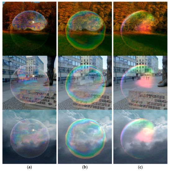 Bubble shows take place in various environments and with different light conditions. For comparative analysis, we compared and analyzed soap bubbles in three settings. Figure 10a shows the results created by the proposed study, and soap bubbles in Figure 10b,c have been simulated according to methods [27,28] in Unity. Soap bubbles are basically fluids, so they reflect, refract and allow passage of light. However, the examples in Figure 10b,c are not suitable for reflection or refraction of light, as observed from the surface. In addition, soap bubbles are fluid, and at the same time, the soap foil has an interference pattern due to thin film interference. Figure 10b shows some interference patterns in the border, but it is not realistically expressed.