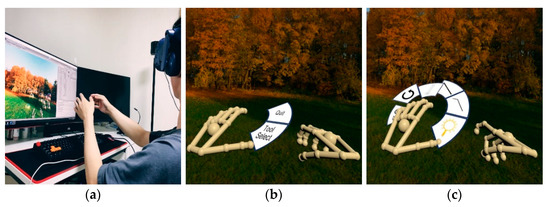 There are various tools for handling soap bubbles to reproduce a bubble show. In this study, tools were largely classified into “straw1”, “straw2”, “tube”, and “hoop”. Straws were subdivided into a large straw (1.3 cm) and a small straw (0.7 cm). For this, Unity version 2019.3.5f1 was used, and the selection and use of tools was performed with Leap Motion. The menu was composed of an upper menu and a lower menu, and was implemented in a HUD format on the left hand. Figure 11a shows a user playing in a virtual reality environment wearing a VR HMD, and Figure 11b shows the upper menu, which appears when you open the thumb of your left hand, and there are “Select Tool” and “Quit” options, the latter performing the HUD shutdown function. The Select Tool allows the user to move to the lower menu as shown in Figure 11c. In the lower menu, the user can select tools such as hoop, straw1, straw2, and tube from the right, and through this, you can experience the soap bubble show. It also has an initialization function that allows you to select other tools.
