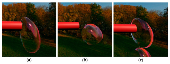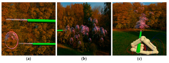 Figure 12 shows soap bubbles blowing out of a straw by applying physically based rendering technology. Figure 12 gathers the appearance of soap bubbles created using small straws. Figure 12a is the first soap bubble in the process of blowing out. During the blowing, you can see that only the cylindrical object is created and that no soap bubbles are created. After the cylindrical object with a separation point is created, bubbles are created at that location. Figure 12b shows a side view of the handling tools. You can see the soap bubbles spread out in several branches along the moving path defined above. Figure 12c shows the tools being handled from the user’s point of view and soap bubbles being blown out.