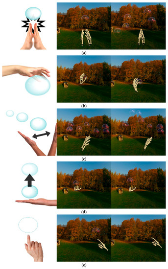 Using Leap Motion, a controller that recognizes hand gestures, it supports interactions to reproduce a soap bubble show in a VR environment. The hand motion was performed through hand motion recognized through Leap Motion. The hand movement for this was performed through the gesture grammar of both hands as follows. Figure 15a is a clap, performed through the gesture of clapping with both hands, and bubbles are created as the left and right hands collide. Figure 15b shows a grab, performed through the gesture of picking up an object with the left hand and catching the soap bubble while colliding with the bottom of the left hand and the soap bubble. Figure 15c shows a fanning motion, performed through a gesture of shaking the left hand from side to side, and bubbles within a certain distance that collide with the left hand will then fly. Figure 15d is bouncing, which is performed through a gesture of shaking the right palm up and down, and when the soap bubbles collide with the right palm, it bounces by receiving force from the physical characteristics. Figure 15e is piercing, performed through a pricking gesture with the index finger of the right hand, and when the index finger and soap bubbles collide, the bubbles burst and disappear. In this way, it is possible to interact in a VR environment through hand motions.