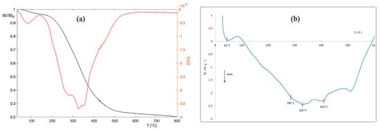 As pointed out elsewhere, TG measurements within a group of specimens provide information about the structural change undergone by the material []. Figure 1a shows TG and DTG profiles for biomass WP measured in N2 atmosphere. The TG curve exhibits two main mass loss contributions. The first mass loss in the range of 20–200 C has to be ascribed to water evaporation or the elimination of volatile substances. The second major mass loss in the range of 200–700 C is due to pyrolysis. Although the TG curve in the pyrolysis region appears to show only one mass loss, the DTG curve shows three different peaks in this region. Such peaks can be more easily interpreted from the DSC curve, which is the result of the pyrolysis of the sample. Indeed, as one can see in Figure 1b, the first major peak, from room temperature to 165 C, is due to the water amount and volatile compounds. The second peak around 290 C can be attributed to hemicellulose decomposition. The third peak centered at 330 C is ascribed to the cellulose decomposition. Finally, the fourth largest peak around 425 C is due to the lignin decomposition [].