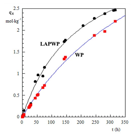 Figure 3 shows (for the sake of simplicity, the subscript A has been omitted) vs. the contact time between the Cr(VI) solution and either the LAPWP or natural adsorbent.