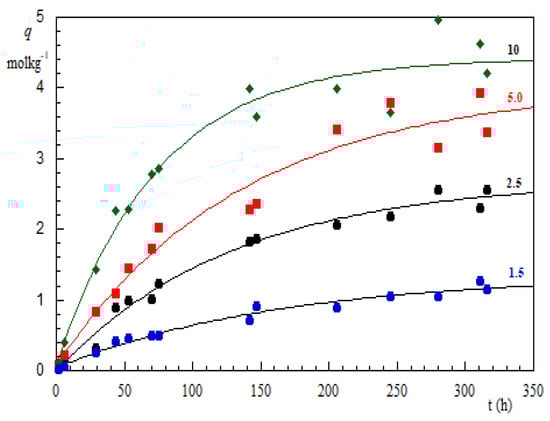 Dry biomass immersed into liquid water absorbs about 40% of its mass. Accordingly, one can estimate that the LAPWP sample contains about 0.4% LAP dispersed in the organic matrix. With this in mind, the experimental results displayed in Figure 3 must consider a synergistic effect between the LAP structure and biomass. Indeed, LAP particles are disk-shaped with a thickness of 1 nm and a diameter of 25 nm. In aqueous medium, at pH 7.6, the faces of the disks assume a negative charge, while the edges exhibit a positive charge []. Furthermore, at pH = 7.6, the biomass surface is slightly negative. Thus LAP-platelets orient their edges to bond with the biomass surface, causing a very extensive perturbation in its three-dimensional structure. This molecular rearrangement of biomass makes many more binding sites accessible for CrO42−, HCrO4− ions. In other words, the synergistic interaction between LAP-platelets and the biomass surface produces a greater number of adsorption sites to the Cr(VI) species. Obviously, the individual molecules diffuse into the material before binding to the adsorption sites. Namely, the diffusion process plays a key role in understanding the synergic interaction between LAP and the organic matrix of the biomass. To gather information in this direction, uptake measurements were performed in the presence of 1.5, 2.5, 5 and 10 g of LAPWP adsorbent, while the Cr(VI) concentration (48.1 M) and the dispersion volume (0.250 dm) were kept constant. All of experimental results are presented in Figure 4 where as a function of the contact time, t, is plotted, for each amount of LAPWP used.
