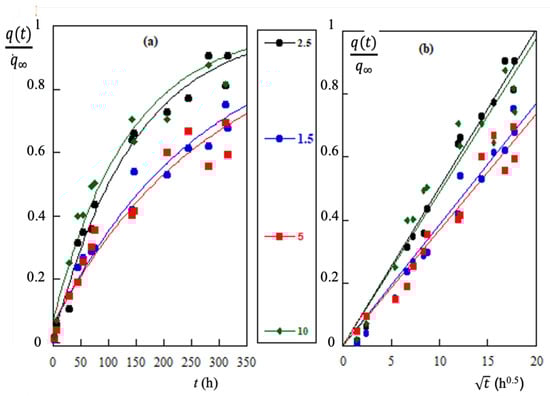 The curves are well fitted to Equation (19), that is to say the experimental values are in good agreement with what would be predicted by the diffusion-binding model. However, if the adsorption process is actually governed by diffusion, the ratio has to verify the parabolic law of diffusion []. For this reason, the experimental values of Figure 6a are also plotted as a function of in Figure 6b. The straight line obtained confirms the prediction based on Equation (19), in other words, the diffusion-binding model explains the experimental results of Cr(VI) adsorption on LAPWP.