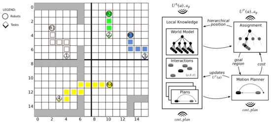 Addressing a persistent and unpredictable service demand with a multi-robot system can provide higher efficiency, thanks to parallel operation, and larger flexibility by modulating the operational costs in terms of robots employed, as well as by deploying robots only where needed. At the same time, the robotic system must prove scalable, fault-tolerant and robust, to ensure continuous and efficient operation despite the number of units deployed, the occurrence of failures, and the variability in the task demands. Concrete solutions can be obtained by addressing two concurrent problems. On the one hand, it is necessary to find a suitable task assignment for each robot, so that costs are minimized in terms of relocation, robot idle time, and task waiting time [3,7,8]. On the other hand, a collision-free trajectory for the robot must be planned in order to safely reach the destination without interfering with other robots’ plans [3,9]. This class of problems is often split in Multi-Robot Task Allocation (MRTA) and Multi-Agent Path Finding (MAPF). A common naïve approach consists in solving MRTA and MAPF separately. However, in cluttered environments, such as indoor spaces, those two problems are tightly coupled: the former provides a set of origin-destination pairs to the latter, which, in turns, returns back actual costs and timings associated to the movements planned by the different robots. For both MRTA and MAPF, many centralized and decentralized approaches exist in the literature (see Section 2). Centralized solutions often rely on perfect intra-robot communication and suffer the well-known issues of scaling with group size—especially when the task demand can rapidly change over time—and of fault-tolerance due to the existence of a single point of failure. Decentralized approaches, on the other hand, potentially feature high fault-tolerance and scalability, but few have been shown to operate in environments with limited communication.