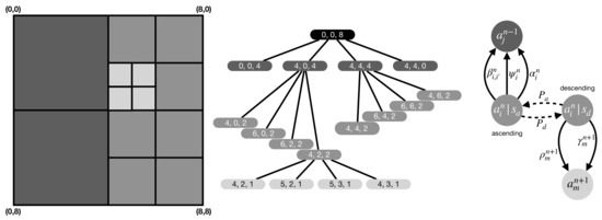 As previously stated, we employ a world model that consists of a hierarchical description of the discretized space, which is represented by a generic k-d tree. Such a hierarchical description is general enough to be automatically constructed, without requiring knowledge about the structure of the work area in terms of rooms, corridors, and connecting spaces. In the following, we consider , that is, a quad-tree where each leaf node relates to a small area where task may require execution, and the root node corresponds to a region representing the whole environment. Leaf and non-root nodes are assigned following the classical quad-tree generation as illustrated in Figure 2 (left and center panels). Every node in the tree is associated with an area characterized by the level in the hierarchy n and an index , so that the area is fully described by the tuple , where are the coordinates of the top-left corner of the considered region and is its length (i.e., nodes closer to the root have greater length). The root node is identified by the tuple , while a single cell can be identified as , where .