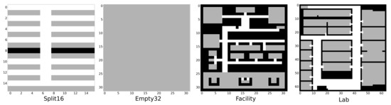 The four environments used in the experimental setup. From left to right: the split16 environment of size , the empty32 environment of size , the facility environment of size , and last the lab environment of size . Black represent walls, white and grey areas are free cells where robots can move, but tasks can appear only in the gray shadowed areas.