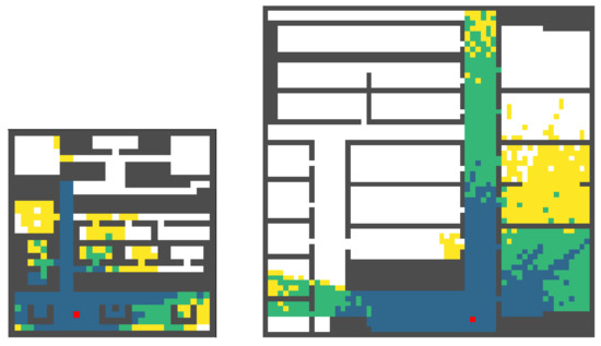 Figure 3 shows the four different environments used in the experiments, featuring different size, i.e., different number of cells: (i) a small two rooms environment, where the total area () is split in half by a wall with a 2-cells opening in the center (split16); (ii) an empty environment of size (empty32); (iii) a facility-like environment of size , with several rooms connected by hallways and one big room that serves as a warehouse (facility); and (iv) a rough reproduction of the floor of the Automatic Coordination of Teams Lab (Robotics and Autonomous Systems Center, University of South California) of size (lab). For the purpose of the experiments, we consider each cell in the grid world to be either free or occupied. A free cell represents empty space where a robot can move and a task appear. For the empty32 environment, task locations are uniformly distributed. In the split16, facility and lab scenarios, potential task locations are specified such that they do not block narrow passages or corridors and only appear inside rooms (see Figure 3). An occupied cell is either an empty cell already taken by a robot—and does not allow the presence of a second robot—or represents a wall or any obstacle not allowing the presence of robots and tasks. Walls and obstacles have an impact on the communication range, following the model introduced in Equations (1) and (2). Figure 4 shows how the environment configuration impacts on the communication range for the facility and lab environments.