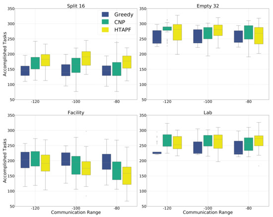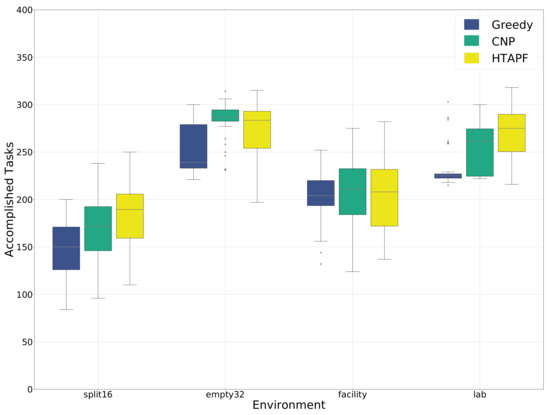 Number of accomplished tasks by the different approaches (greedy, Contract Net Protocol (CNP), and HTAPF) across the different environments, obtained with unlimited communication and no robot failures. For each condition, 50 independent simulations are performed and the data displayed by a box-and-whiskers plot. Each box represents the inter-quartile range of the data, and the median is displayed as a line cutting the box in two parts. Whiskers extend to 1.5 times the top and bottom quartiles. Dots represent outliers.