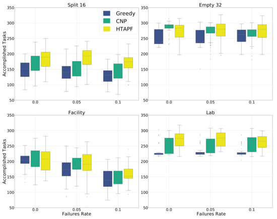 The facility environment is the one that presents the harshest communication limitations, with thick walls preventing a proper exchange of information. In such conditions, the performance of CNP and HTAPF gets worse and the greedy approach proves more robust as it does not rely much on communication. Significant differences are observed when , where the greedy approach outperforms both CNP and HTAPF (see Figure 6, bottom-left, and Table 2). In case of failures, all approaches show a similar drop in performance, due to failed robots blocking corridors or doorways, and no algorithm is more robust than the others (see Figure 7, bottom-left, and Table 3).