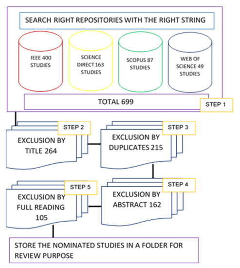 In the above steps (from top to bottom), Step 1 shows the number of studies returned from each database, with a total of 699 studies. In Step 2, we excluded those mismatched by title. In Step 3, deletion of the duplicates was performed. In Step 4, the abstracts were read, and those that were out of our scope were excluded; and finally, in Step 5, a full reading of the remaining articles was performed. We also applied the inclusion and exclusion criteria in every step if matched.