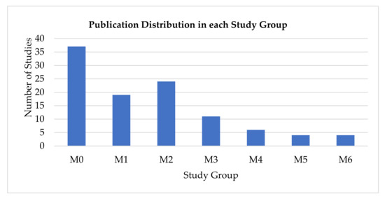 In order to see how the existing studies used performance metrics, we grouped our collected studies based on the number of metrics used. After full reading, we found that the maximum number of metrics used in the nominated studies was six. Thus, our grouping strategy adopted these abbreviations: M0 means zero metrics, M1 for one metric, M2 for two metrics, M3 for three metrics, M4 for four metrics, M5 for five metrics, and M6 for six metrics. This means articles that had not employed or not reported the defined performance metrics would be listed in the M0 group and those with one metric in M1, etc. Figure 3 shows that most of the studies, based on this grouping, used zero metrics, which accounted for 37 articles, and the second rank deployed two metrics. Meanwhile, the graph shows a decline in the studies that employed more than two metrics. It is worth noting that only four studies employed six metrics (M6), and four others used five metrics (M5). However, to make it more meaningful, we needed to address what the dominant metrics were, thus creating another detail from this point by showing how they (the 27 metrics) were used over 105 studies. This would answer another RQ.