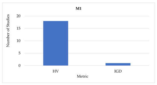 From this point of discovery, tallying of the used metrics is discussed. It is not surprising that some of the employed metrics were selected, due to their broad usage in the literature [10,46]. We only tallied the sections of the studies that used performance metrics; hence, those using zero metrics were excluded, such as the M0 set. With the help of Excel spreadsheet visualization, the obtained result is presented in figures. Figure 4, which shows the distribution of the metrics for the M1 group, which had a total of 19 articles, yet they employed one metric in each of the studies, and therefore, there were only two unique metrics involved, which were HV and IGD. However, IGD was only used once, while HV was used 18 times in this set of the M1 group.