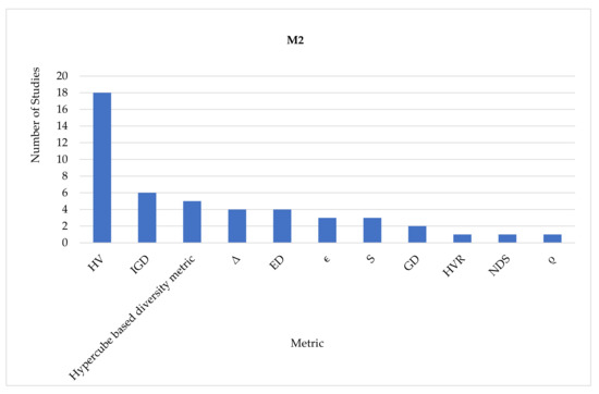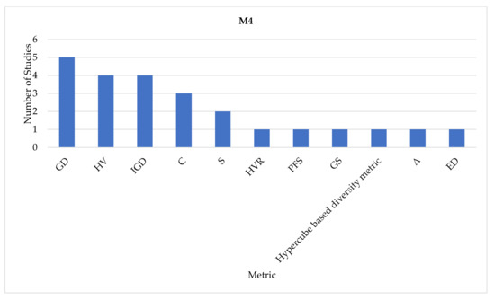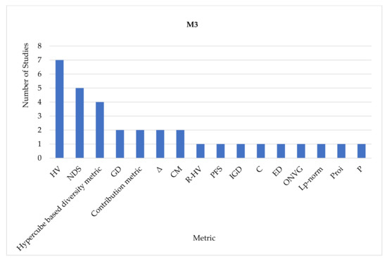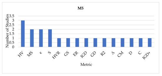 Figure 5 shows that a total of 24 articles employed sets of two metrics. Although the number of studies involved in this group (M2) was more than the previous one (M1), it comprised a good number of metrics (good diversity with a total of 11 unique metrics), and yet HV and IGD were the leading ones, which means they were the most used metrics. HV was used 18 times, IGD was used six times, and there were nine other additional metrics in this set, which were the hypercube-based diversity metric, which was used five times, and delta spread (∆) and ED, which were used four times each. The remaining metrics were used as follows: ϵ and S were used three times each, GD two times, and finally, HVR, NDS, and ρ (convergence measure) were used only one time each.