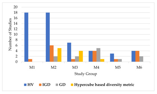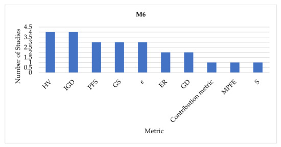 Figure 6 shows a total of 16 metrics that appeared in the publications. After comparison according to their usage, HV was found to be the highest in total with seven cases, while NDS and the hypercube-based diversity metric were ranked five and four, respectively. While GD, the contribution metric, ∆, and CM were used two times each, and the remaining nine metrics in this list had the lowest values, only having been used once.