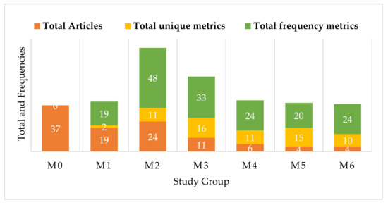 In this RQ, we also identify and further investigate the study groups by showing the total number of studies in each study group, their total number of unique metrics, and their total frequency metric.