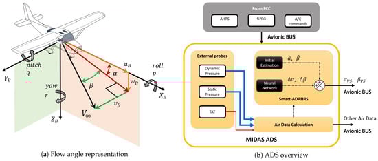 Exploiting the advantages of the fly-by-wire (FBW) technology, the air data system will receive, as input, consolidated data from the avionic bus (introduced in Section 3.2) to be fused with measured ones (introduced in Section 3) in order to estimate AoA and AoS with high reliability, as schematically presented in Figure 3b.