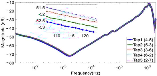 The FRA of the proposed lumped RLC model was plotted at the same tap positions by changing the RLC values shown in Figure 7, which shows a similar profile to the measured signatures shown in Figure 5. The slight change in the transfer function magnitude from a tap position to another was attributed to the change in the equivalent electrical parameters. However, the location of resonance frequencies was not changing.
