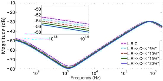 Like the measured FRA signatures, Figure 20 indicates a significant reduction in the transfer function’s amplitude in the frequency range 20 Hz to 3 kHz for both types of faults. For both faults, the slight increase in the resistance contributes to reducing FRA signature toward negative magnitude. However, there is a drastic decrease in transformer capacitance, which causes the frequency slope to shift towards low magnitudes in the low-frequency region. There was also a slight shift in the frequency response toward the low frequencies, as shown in the inset plot in Figure 20. This shift occurred due to the increase in transformer shunt capacitance.