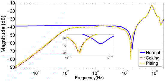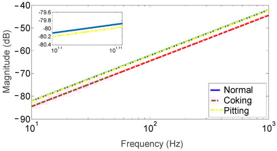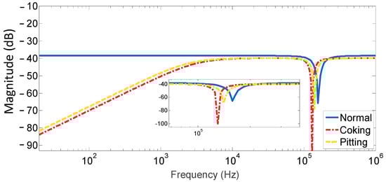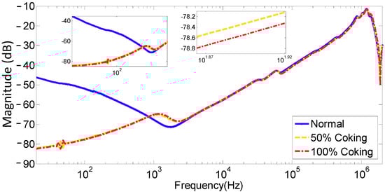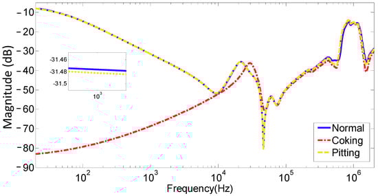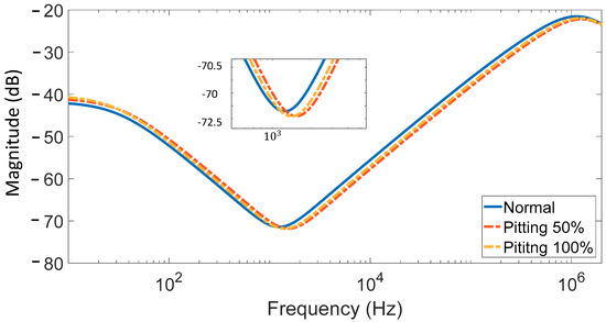 Results in Figure 10 and Figure 11 show a slight variation in the FRA signature due to contact pitting. At the low-frequency region and due to pitting, the FRA signature tended to shift upward when compared with the normal condition due to the reduction in resistance and inductance values. At the mid and high frequency ranges, the FRA response tended to shift downward due to a decrease in the capacitance value. According to the degree of severity, it can be shown that at 100% pitting, the signature exhibited a higher shift than the 50% pitting, which was attributed to their effects on the resistive and capacitive components.