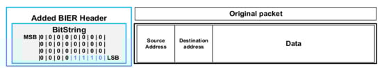 We suggest using a BIER header, among other things, that contains a special field called the Bit-String (BS) (Figure 6). The Bit-String is an array of bits, in which each bit indicates exactly one specific router in the BIER domain [73,74].