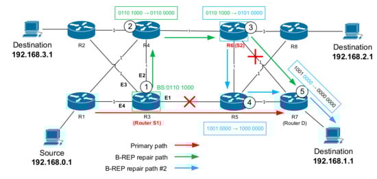 Let us briefly explain the elementary principles of B-REP FRR on a more illustrative example of the topology shown in Figure 8. We have already used the topology to illustrate examples of B-REP tables. Assume that the link between R1/R3 has failed and the protected flow directed towards the destination is therefore affected. Router 1 detects the link failure and becomes the router S. Router S selects a given backup path from the B-REP BP table based on the identity of the failed interface and the specific IP address of the protected flow. The S router encapsulates the packet of the original flow with a new BIER header and inserts the corresponding BS value into the BS field. The BS value of 01110 specifies a route via R2, R4, and R3. Based on the BS values, R1 sends a BIER packet towards the next-hop of a new alternative route, router number 2.
