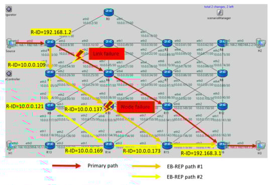- Harada, Y.; Hui, W.; Fukushima, Y.; Yokohira, T. A reroute method to recover fast from network failure. In 2014 International Conference on Information and Communication Technology Convergence (ICTC), Busan, Korea, 22–24 October 2014; IEEE: New York, NY, USA, 2014; pp. 903–908. [Google Scholar] [CrossRef]