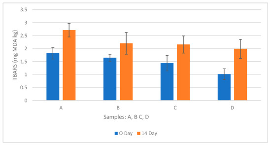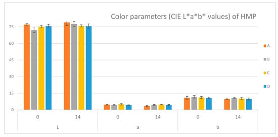 Yellowness index (b* values) indicated crucial changes in quality, e.g., bacterial deterioration or oxidation, which disqualifies the meat for usage. The higher the b* values, the greater the “oxidized/reductive form” ratio. Desired meat products are characterized by a b* value near zero and, there, the yellow and blue colors were not dominated [18,19]. In our study, the b* values of samples A and D did not differ statistically. This trend was also maintained after the storage period and the b* values of all samples on day 14 were lower than the values recorded on day 0.