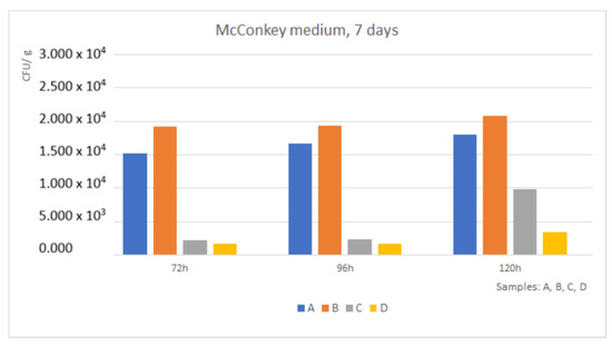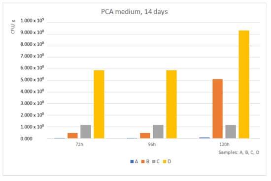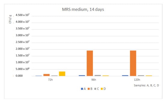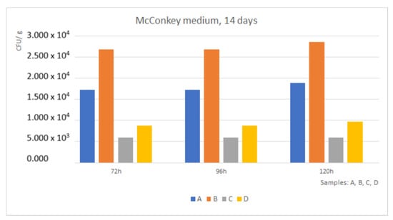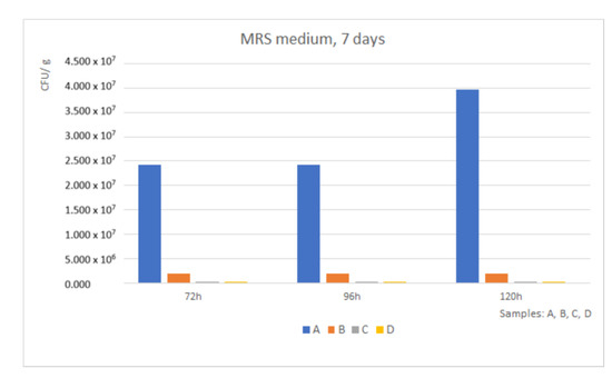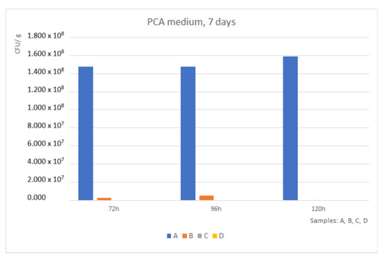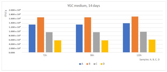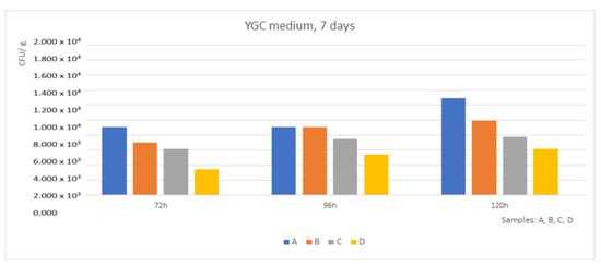 The content of microorganisms in the samples were assessed by using the plate method. A total of 6 media selective for specific groups of microorganisms were used: PCA, Plate Count Agar (Merck Millipore, USA), YGC, Yeast Extract Glucose Chloramphenicol (BTL Sp. z o.o Łódź, Poland), MRS, de Man, Rogosa i Sharpe(BTL Sp. Zoo, Łódź, Poland), McConkey (BD GmbH, Heidelberg, Germany), BACARA ® (Biomerieux, Warsaw, Poland), ChromiD (Biomerieux, Poland). Samples were taken sterile (5 g each), placed in sterile bags and homogenized with 45 mL of sterile physiological fluid (0.85% NaCl) for 2 min using a Stomacher 400 LAB Blender (Seward Medical, London, UK). Serial dilutions of the samples were prepared and plated on the media to identify the presence of microorganisms and determine their viability. The determinations were made in control samples (without GRF) and tests with the addition of GRFP (B, C, D) after 7 and 14 days of refrigerated storage (4 °C). A total of 120 h of incubation time and temperature 30 ± 1 °C were set. Readings were made manually (colony counter N.USUI and Co. Ltd., BIO KOBE, Japan) after 3, 4 and 5 days of incubation and expressed in CFU per 1 g of test products Antimicrobial assay was performed in duplicate for two batches. Results were averaged for two biological replicates (part 1 and part 2).