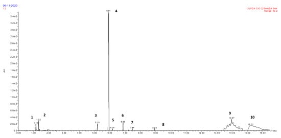 Representative UPLC-MS chromatogram of HMP with the highest level of GRFP addition (D sample, 0.15 g/100 g). Chromatogram was obtained at 320 nm. The compound numbering is listed in Table 3.