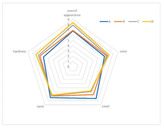 Sensory evaluation of HMP with GRFP addition. Samples: A (control sample); B (0.05 g/100 g); C (0.1 g/100 g); D (0.15 g/100 g).