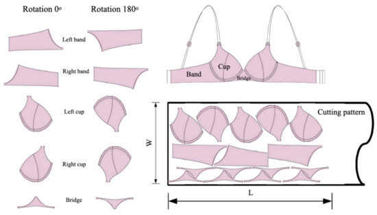 As we can see in Figure 1, the cutting is the main section that defines the quantity of material used because the material will be processed from a large roll into pieces and prepared for transfer to the sewing section. Thus, a plan is required before material cutting. Although, there is a designed program that supports the planning, the current practice is still trial and error based on worker experience. In other words, the responsible person will test the arrangement pattern and then consider if there is a chance for further improvement based on her experience. For this reason, improvement in the cutting plan will help in material and cost-saving. From the data mentioned, the main issue in this case study is determining a plan for material cutting that meets the amount that customers require and utilizes materials effectively. This issue can be identified as Two-Dimensional Cutting Stock Problem. Initially, the MFCA has not been acknowledged in this case study. Hence, the present cutting plan is considered to be the most effective pattern. If the MFCA has not been implemented, the main loss at the cutting process has not yet been identified. Moreover, the study reveals that not only the main material is lost from cutting, but indirect loss also occurs, such as time-wasting for trial and error. Workers spent time trying to find the cutting pattern with nothing as the guarantee that it would be the best. For each cutting, a paper plan was printed to place on materials before the actual cut. The cutting also required a cutting mat to prevent the materials from slipping and paper to divide the shades of materials that came from different rolls. Moreover, a plastic cover was used for auto cutting. For example, the cutting pattern for the WB1234 model with 1000 orders, cup size (e.g., bra size, the smallest of which is A) A, B, C, and D. There are four different under-bust sizes which are 70, 75, 80, and 85. A bra is assembled with 5 parts which are the right cup, left cup, right band, left band, and bridge. The number of orders for each cup size is also different. For example, A85 will not be produced as it is a small cup group, but A75 is made at the maximum quantity as it is standard size and has a higher sales amount than other sizes. The D70 and D75 have not been produced as they are large cups which causes the under bust size to be bigger, as well. In the case of producing 150 pieces of A70, it does mean there are 750 parts required for pattern making. Similarly, 1000 orders of the WB1234 model needs 5000 pieces of a cutting pattern which also depends on stretching pattern and the rotation can be adjusted at only 0 and 180 degrees due to the limitation of fabric lines as shown in Figure 2.