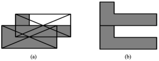 Polygon A and B move in a counterclockwise direction. The NFP calculation is used to find the combined edges between and , in which contains the same edges as but moves in a clockwise direction. The NFP of polygon A and B is retrieved when the edges of both polygons are arranged and connected at each angle. For the non-convex type polygon, the calculation requires various methods that have been presented by numerous researchers. The calculation example is shown in Benell et al. [35] and O’Rourke [36].