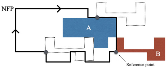 The basic idea behind the no-fit polygon (NFP) was originally proposed by Art [32]. The NFP is a tool that can be used for identifying the position in which two can be close with no overlaps. This method has been acknowledged for its efficiency and has been used to solve problems, such as identifying motions of robots. The NFP is generated by two polygons in which the first polygon is fixed, while the second polygon is orbiting. The direction of this movement is called an NFP. If the reference point of the second polygon is in the NFP, an overlay has occurred. If the reference point is outside the NFP, the polygons are not touching. And if the reference point is on the NFP, this shows that both polygons are attached perfectly. Figure 7 illustrates that polygon A is fixed and B is moving. The dot lined shape represents the NFP and its position. Polygon B is in a position of close arrangement with polygon A.
