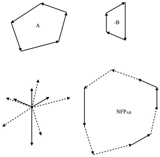 The no-fit polygon convex type can be calculated by Minkowski’s Different [33,34], which states that an NFP is equal to the difference of both polygons.