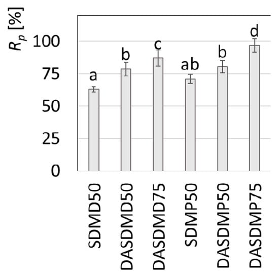 Moreover, obtained results indicate the significance of the carrier used, which can be observed in the variants with the lowest carrier content. The Rp of buckwheat honey powder spray dried with MP as a carrier was significantly higher than with MD, though only for sample DASD75 was the difference statistically significant. As presented before by Jayasundera et al. (2009), Shi et al. (2013) and Bhusari et al. (2014), obtained results confirm that carriers containing proteins with film-forming ability prevent inner particles’ sticking and particles sticking to the walls of the drying chamber, which in turn increases Rp [31,35,36]. Despite the fact that lactose characterizes with significantly lower Tg (101 °C) than MD (100–243 °C, depending on dextrose equivalent), due to the additional combination of film-forming properties of milk proteins, variants with MP as carrier resulted in higher Rp [13].