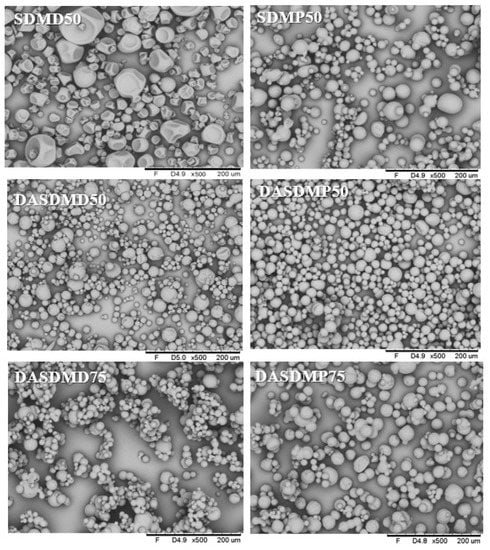 Particles of obtained buckwheat honey powders (Figure 2) were mostly spherical, with the exception of SDMD50, which had more irregular particles that were bigger in size (the highest D50). Spray drying at higher drying temperatures, as in the case of SDMD50, leads to early structure formation of rigid particles, which results in greater D50. Samborska et al. (2020) stated that an increase in particle size is usually observed when the stickiness related to low Tg, increases [17]. This implies that variant SDMD50 was more difficult to spray dry than other variants, which was confirmed previously by the lowest Rp and can be observed as well on cumulated particle size distribution curves (Figure 3). Moreover, particles were usually scattered, except for DASDMD75, in which clusters were formed. The cluster-type morphology is also characteristic of materials difficult to spray dry due to a stickiness; thus the variant DASDMD75, with high honey content, can be classified as problematic as well based on morphology analysis. Moreover, difficulties in spray drying of this variant can also be seen on cumulated particle size distribution curves (Figure 3). However, this was not confirmed by Rp, presumably due to the increased size of created clusters that can be observed in high D50 (Table 3), which promoted the effective powder separation in a cyclone. Smaller bridges between particles were also present in SDMP50 and DASDMP75 variants, with SDMP50 having the lowest Rp. However, DASDMP75 had the highest Rp even though the morphology indicated that it could have been a variant that caused problems during spray drying, as particles were visibly more piled up together as a result of the high honey content. This lends support to previous findings in the literature by Samborska et al. (2017), who noted the same results when carrier content in honey spray drying was decreased from 50 to 25% [41]. As discussed before, Rp is a factor that can also be dependent on other properties like Dap due to the impact on cyclone efficiency. DASDMD50 and DASDMP50 had small, scattered particles, indicating easy drying at low temperature and with a high content of carrier.