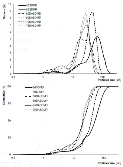 Particle size distribution and cumulated particle size distribution of buckwheat honey powders containing 50 and 75% honey solids obtained with maltodextrin (MD) or milk powder (MP) as carriers by conventional spray drying (SD) and dehumidified-air-assisted spray drying (DASD).