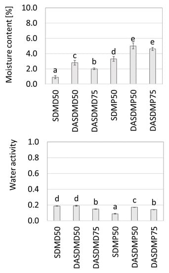 The MC of obtained buckwheat honey powders did not exceed 5% (0.9 ± 0.2–5.0 ± 0.4%), which in combination with water activity (aw) well below 0.3 (0.088 ± 0.005–0.190 ± 0.005) (Figure 4), indicates good storage stability due to low free water availability for potential microbial growth and biochemical reactions [31,43]. It can be observed that the MC of powders spray dried with MD as a carrier was significantly lower than powders with MP as a carrier, and aw was higher. This phenomenon was related to proteins’ ability to hold water in the amorphous matrix, resulting from the formation of a film on the particle surface; this was noted as well by Bhusari et al. (2014), who spray dried tamarind pulp powder with whey protein concentrate (WPC) as a carrier [36]. Suhag and Nanda (2016) studied honey powders with different carrier agents, including MD and WPC, noting significantly higher moisture content when WPC was used a carrier than when MD was applied [15].
