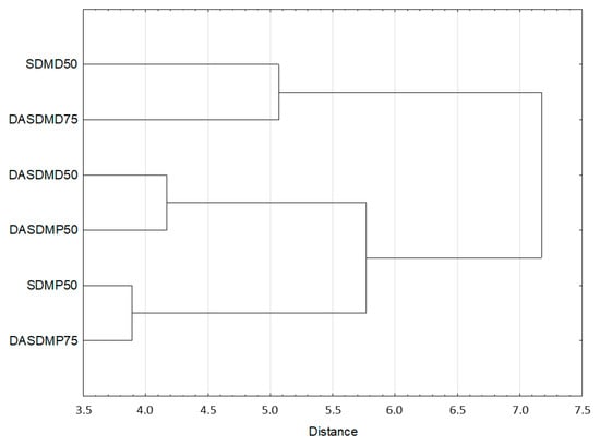 The HCA analysis (Figure 5) supported previous findings that variants SDMD50 and DASDMD75 are considered as the most problematic during spray drying, as they create one cluster. This was especially manifest in particle morphology, Rp and on cumulated particle size distribution curves. Variants DASDMD50, DASDMP50, SDMP50 and DASDMP75 were grouped in two other clusters; however, they also created one cluster, confirming that these variants were less problematic to spray dry, as was explained before.