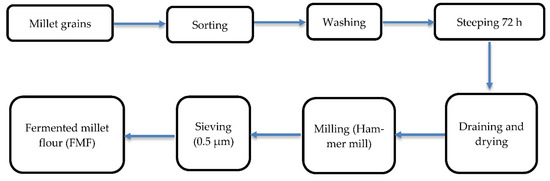 The schematic diagram of making the fermented millet flour can be seen in Figure 2, which followed the method described by Sengev, Ingbian, and Gernah [29] with slight modifications. Whole (pearl) millet grains have been sorted and cleaned to remove unwanted materials, and subsequently, thoroughly washed with running tap water. Thereafter, it was steeped for 72 h, after which the grains were drained, followed by sun-drying, then milling and sieving, which helped to achieve the fermented millet flour.