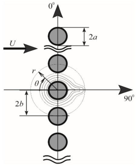 Schematic diagram of a separate row of arranging parallel fibres (calculation section): a—fibre radius, m; b—distance between the axes of the adjacent cylinders, m; r, θ—polar coordinates; U—air velocity m/s.