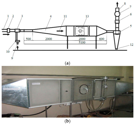Test stand: (a) schematic view; (b) general view; 1, 9: compressed air supply; 2: pre- filter for compressed air treatment; 3: ejector; 4: diffuser; 5: cyclone; 6: flowmeter; 7: exhaust fan; 8: outlet pipe; 10: dust generator; 11: dust distributor; 12: damper; 13: test chamber.