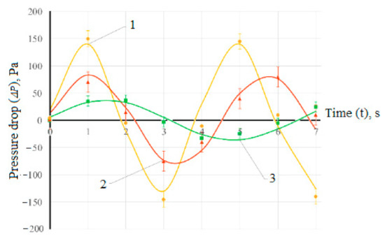 The value of the pressure drop is decisive when both calculating the period of protective action and assessing the protective efficiency of the respirator. Thus, due to the presence of peak values, which are characteristic of the oscillating air motion, the filtration rate will also change [62]. This can lead to an increase in the uneven distribution of air load over the area of the filter and the appearance of sections in which the penetration rate will increase sharply. The latter is decisive for the period of protective action, which can be estimated by the known formulas [63] for dust filters: