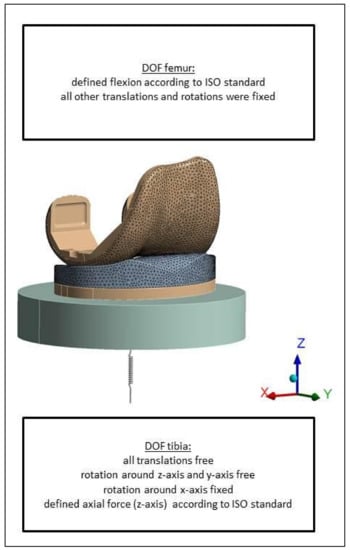 In contrast to the force-controlled standard, there is no anterior/posterior force or internal/external torque defined in ISO 14243-3:2014. The movements in these directions are displacement-controlled. These boundary conditions were changed in the computer model according to the ISO standard [14]. Furthermore, no restraint system is required due to the displacement-controlled movement, which is why the spring elements were removed in the in silico model. The axial force and flexion profile were not changed in the model because they are equal to those in the force-constrained ISO standard.
