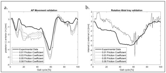 Validation with the deep dish (DD) inlay with different friction coefficients; (a) anterior/posterior (AP) movement, (b) tibia rotation.