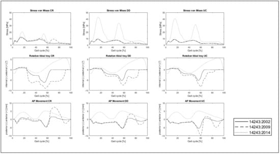 The results of this comparison are presented in Figure 3. Stress in the CR inlay during the gait cycle showed two peaks of 12.38 MPa and 9.27 MPa for FC-2002 and another two of 20.59 MPa and 17.19 MPa for the DC-2014 standard. FC-2009 generated three maxima of 11.15 MPa, 10.15 MPa, and 9.16 MPa. These results are also shown in Figure 4. For the anterior/posterior translation of the tibia, one maximum was seen at 57% of the gait cycle in the posterior direction (4.74 mm) for FC-2002, and a second maximum was observed at 71% of the gait cycle for FC-2009 in the anterior direction (7.51 mm). DC-2014 generated an anterior/posterior movement profile of two maxima in the anterior direction, as predefined at 18% and 57% of the gait cycle, with values of 4.47 mm and 5.13 mm, respectively. Rotational data showed an internally rotating tibia for FC-2002, with a maximum of 6.18° at 54% of the gait cycle, and for FC-2009, with a maximum of 9.00° at 56% of the gait cycle. DC-2014 generated, as predefined, one maximum at the end of the gait cycle of 90% in the 5.72° external direction.