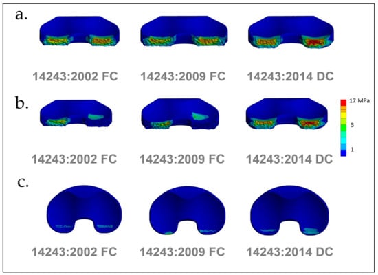 Stress in the cruciate-retaining (CR) inlay for different ISO norms: (a) first peak, (b) second peak, (c) third peak.