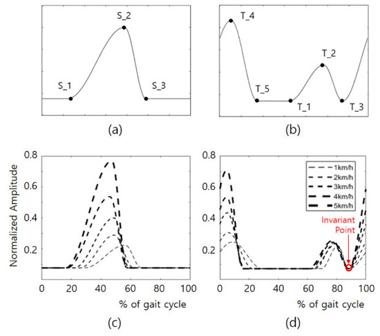 Based on the muscle activation model, the EMG envelopes were functionalized using trigonometric functions by using a curve fitting tool in MATLAB software (MathWorks, Natick, MA, USA). Functionalized EMG envelopes are shown in Figure 3. The minimum and maximum amplitudes of the functionalized EMG envelopes were chosen as feature points. Figure 3a,b show the feature points in the percentile gait cycle, where the soleus and TA had three and five feature points, respectively: S_1, S_2, and S_3 for the soleus and T_1, T_2, T_3, T_4, and T_5 for the TA. Figure 3c,d show the changes in the functionalized EMG envelopes depending on the changes in the walking speed. The observations from the gait experiments showed that the positions of all the feature points in the percentile gait cycle varied depending on the walking speed, except for T_3, as shown in Figure 3d.